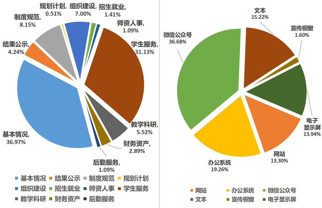 在主动公开的信息中,通过校园网及院外有关机构及部门网站(中直采购网、国家研招网等)方式进行公开的信息290条;通过院内办公系统方式公开的信息420条;通过文本方式公开的信息332条;通过宣传橱窗公开的信息35条;通过电子显示屏公开的信息304条;通过微信公众号公开的信息800条。
